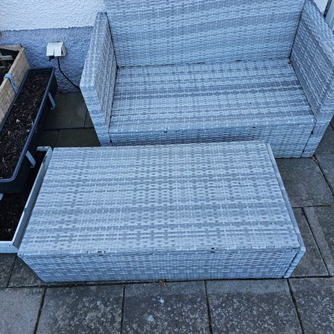 Tvåsitsig trädgårdssoffa i grå konstrotting. Soffan har två separata sittplatser med hög rygg och ett fast mittparti som fungerar som bord eller avställningsyta. Passar för utomhusbruk på altan, balkong eller i trädgård. Sitsar och ryggstöd är flätade i konstrotting med metallstomme för stabilitet.
