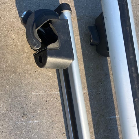 Takräcke i aluminium med tillhörande fästen. Består av två lastbågar i silverfärgad aluminium och fyra svarta fot/fäst-enheter. Avsett för montering på bilens tak för transport av till exempel takbox eller annan last.