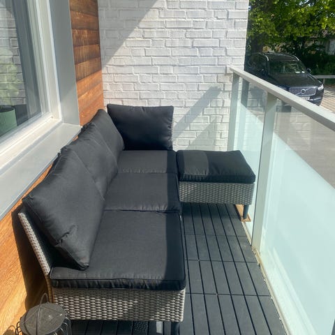 Santander loungegrupp från Svenssons i Lammhult för uteplats eller inglasad balkong. Gruppen består av fem fristående fåtöljer/moduler, ett lågt kvadratiskt soffbord samt ett lågt sideboard Stomme i mörkgrå metall med grå sitt- och ryggdynor i utomhusanpassad textil. Modulerna kan kombineras som man önskar och sätts ihop med tillhörande klamrar.