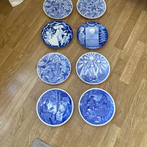 Rörstrand tallrikar i blåvitt porslin. Tallrikarna har dekorerade motiv i blått på vit botten. Passar som mattallrikar eller uppläggningsfat och kan även användas som samlarobjekt eller dekoration i kök och matsal.