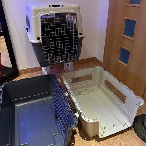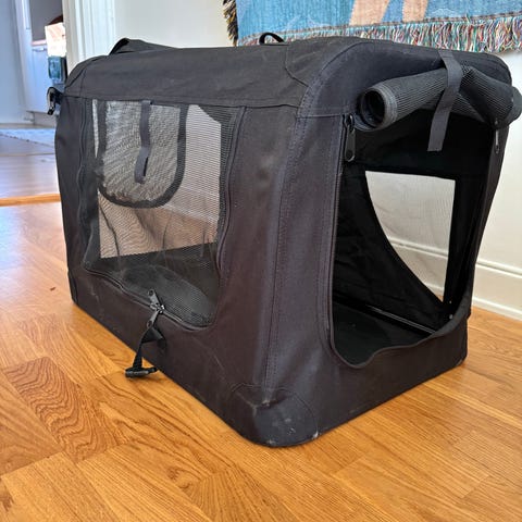 Svart mjuk transportbur för hund eller katt. Buren är tillverkad i tyg med nätpaneler på sidor och ovansida för ventilation och insyn. Öppning finns framtill samt upptill med dragkedja. Utrustad med bärhandtag och remmar för enklare transport. Passar för användning hemma, i bil eller vid resor där ett avgränsat utrymme för husdjuret behövs. Ihopfällbar.