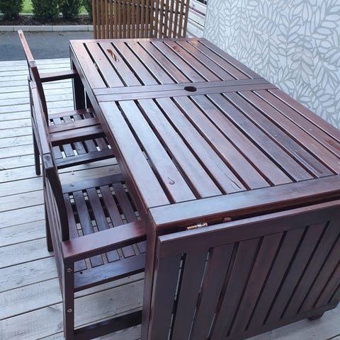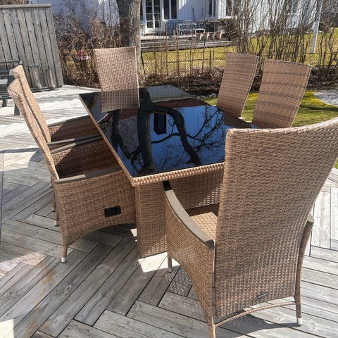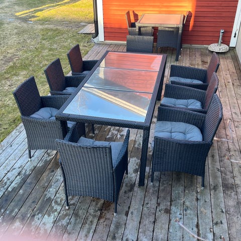 Matgrupp för utomhusbruk bestående av rektangulärt bord och 4 stycken stolar i svart konstrotting. Bordet har skiva med längsgående ribbor och ben i samma stil som ramen. Stolarna har armstöd och hög rygg med flätad konstrotting runt om. Gruppen är anpassad för altan, balkong eller uteplats. 4 stycken överdrag för skydd vid förvaring utomhus ingår.