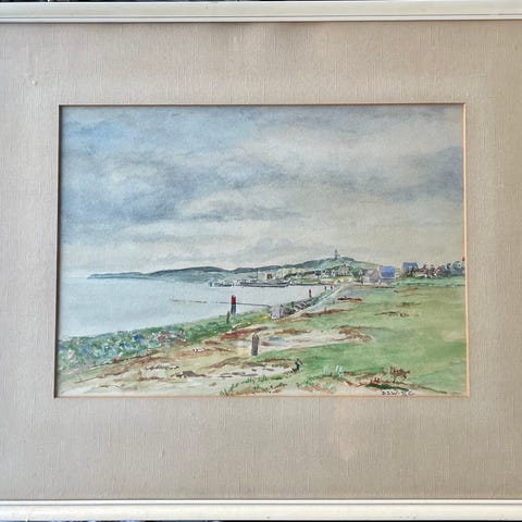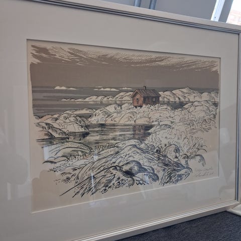 Litografi av den norska konstnären Omar Andreen (1922-1980) med motiv av kustlandskap med klippor, gräs och havsvik. Verket är signerat av konstnären och daterat 1981. Bladet är numrerat 19/200. Trycket är monterat i passepartout samt inramat med glas och ram. Ramens mått är 50 × 60 cm (bildmått 34 × 41 cm).