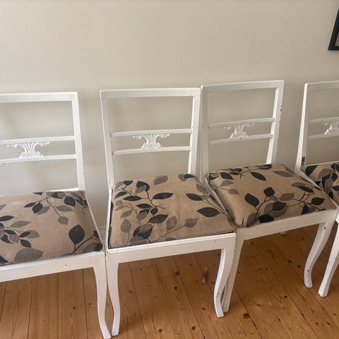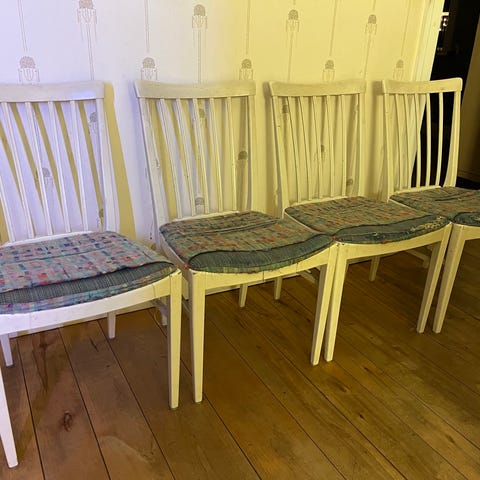 4 vita stolar från vintage-IKEA serie Petra som tillverkades på 1960-talet. Dessa ska vara från 1968 och kostade som nya 64 kr st. Spår av användning finns i form av skrap och märken samt krackeleringar i färgen. Stabila och med nytt tyg i klädseln. Höjd i bakkant ca 80 cm, bredd ca 46 cm, sittdjup ca 40 cm samt sitthöjd ca 46 cm. Finns i Sätila, Marks Kommun men kan levereras till tex Göteborg, Stockholm och Malmö med omnejd mot ersättning. Priset avser alla 4 tillsammans.