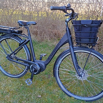 Yosemite City connect elcykel med lågt insteg och svart/silverfärgad ram. Cykeln är utrustad med mittmonterad motor och batteri placerat på underröret. Pakethållare bak och plats för korg.