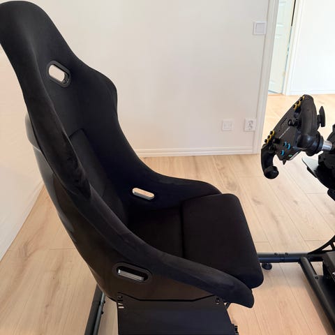 Racingsäte stol i svart utförande. Sätet har hög rygg med öppningar upptill för exempelvis bälten och en formad sittdel för bättre stöd. Passar till exempel för simulatorrigg, gaming eller som extra stol där ett racingsäte önskas. Ryggen är ställbar.