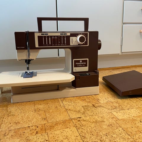 Mycket fin och gedigen Husqvarna symaskin Model 5710, dock med en pedal i behov av renovering då den ej fungerar. Praktisk maskin i sitt format då allt ryms under kupan när man vill packa i hop den. Medföljande tillbehör: förlängningsbord, fotpedal (defekt), tillbehörslåda med spolar och 8 olika pressarfötter samt hårt plastfodral och bruksanvisning.