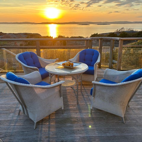 Utemöbelgrupp i konstrotting bestående av en soffa, två fåtöljer och ett rektangulärt bord med glasskiva. Rottingen har släppt på karmarna på en av stolarna och dynorna är solblekta.
