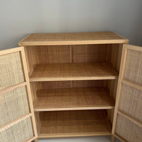 Skåpet är i fint skick men rottingen har spruckit på två ställen, se bild 7. Bänk i ok skick, se yta bild 8 och 9. Limmas lätt med ny rotting som man kan få med på köpet vid intresse.