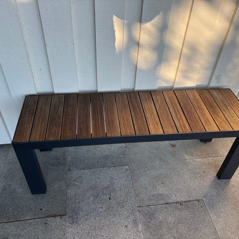 Fin trädgårdsbänk i cortenstål, väldigt tung och rejäl. Svart pulverlack som är i fint skick.