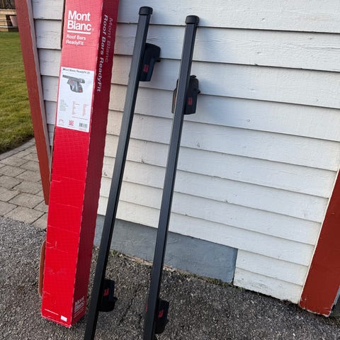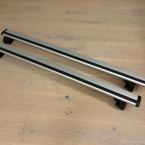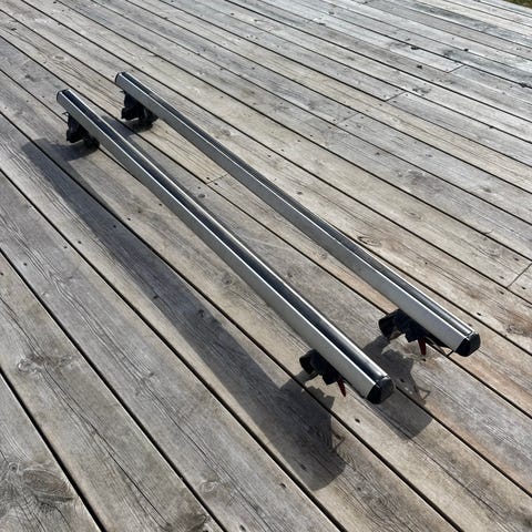 Takräcke i aluminium för montering på bil. Består av två lastbågar med svarta fästen som kläms fast i bilens takkanter. Passar för transport av till exempel takbox eller annan last som är avsedd för montering på takräcke. Exakt bilmodell och mått är inte angivna och bör kontrolleras mot bilens specifikationer innan användning.