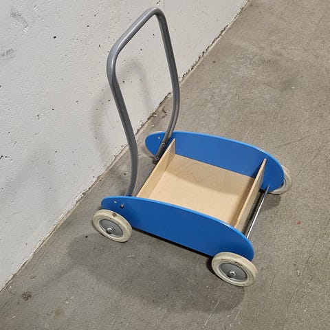 Lära-gå-vagn / aktivitetsvagn i trä (barn 1–3 år) i gott skick.