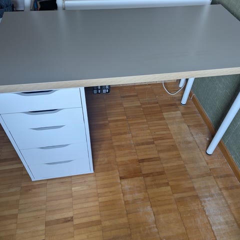 Skrivbord med rak vit bordsskiva och grå lådhurts med fyra utdragbara lådor. Bordet har ben i metall på ena sidan och hurtsen som stöd på den andra sidan. Passar som arbetsplats i hemmakontor, studierum eller sovrum. Bordsskivan ger gott om yta för dator, skärm och skrivmaterial, medan lådorna ger förvaring för kontorsmaterial och andra mindre saker.