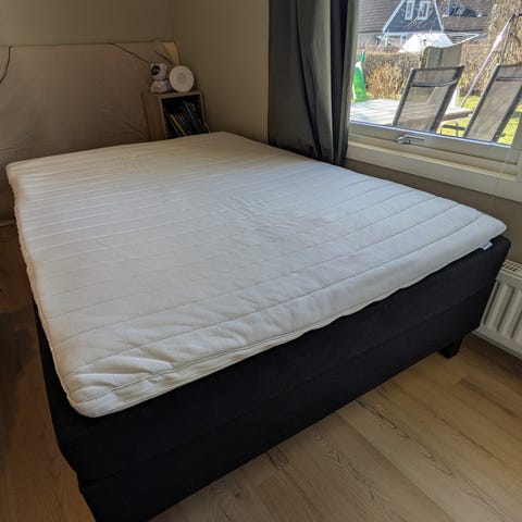 Även sänggavel från IKEA säljes, med inbyggda dolda hyllplan. Mått: B186, H110, D28.