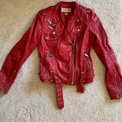 Skinnjacka i stadigt läder, jättefin passform , fina detaljer med tryckknappar och kraftiga dragkedjor. Italiensk storlek 40 som motsvarar 36-38 .