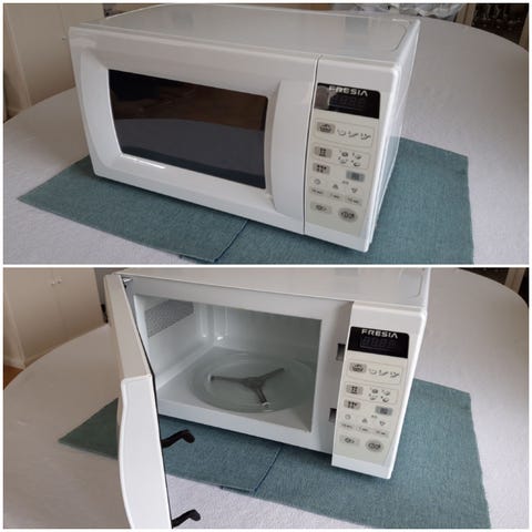 Whirlpool mikrovågsugn i vit färg. Fristående modell med sidhängd dörr och roterande tallrik invändigt. Utrustad med digital panel med display och knappar för inställning av effekt, tid och olika program.