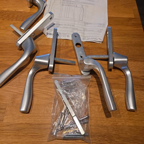 Handtag för altandörr i borstad metall i silverfärg. Handtagen har greppvänlig form. Fyrkantspinnen är synlig på bilderna och kan mätas mot måttbandet för att kontrollera passform mot befintliga fönsterbeslag. Lämpliga som ersättningshandtag till fönster eller altandörrar med motsvarande infästning.