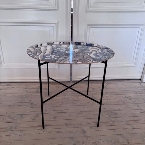 Bricka och vitt brickstativ från Svenskt Tenn i mycket fint skick. Brickan är 65cm i diameter med blå bakgrund och vita elefanter som inte säljs längre, och stativet är 65x55cm.