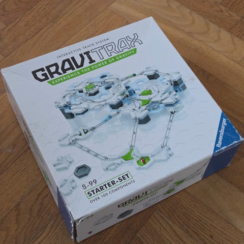 Gravitrax Starter-Set kulbana byggsystem. Interaktivt spårsystem där kulor rullar genom olika banor och hinder. Setet innehåller ett flertal hexagonformade delar, höjdklossar, rälsdelar, start- och målmoduler samt kulor. Avsett för barn från 8 år och uppåt. Möjlighet att bygga olika banor och experimentera med hastighet, lutning och gravitation. Levereras med originalkartong och instruktioner enligt bilderna.