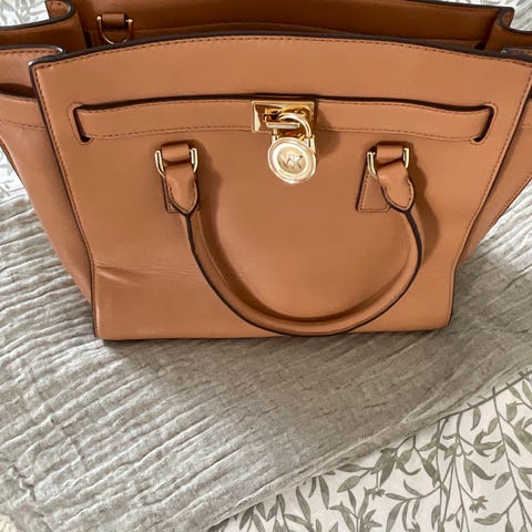 Handväska från Michael Kors i vitt med brunt monogrammönster och bruna detaljer. Väskan har två handtag och en avtagbar axelrem. Huvudfacket stängs med dragkedja. Inuti finns flera mindre fack för organisering. Guldfärgade metalldetaljer, inklusive en logoplakett framtill och en berlock med MK-logotypen.