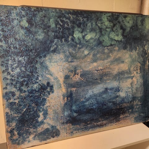 Säljer en vacker abstrakt tavla med struktur och djup. Tavlan går i mjuka, jordnära färger som beige, guld, blågrönt och rostiga toner, vilket ger ett lugnt men samtidigt levande uttryck. Motivet kan tolkas som ett landskap med vatten och natur, vilket gör den lätt att placera i många typer av hem – från modern till mer klassisk inredning.
