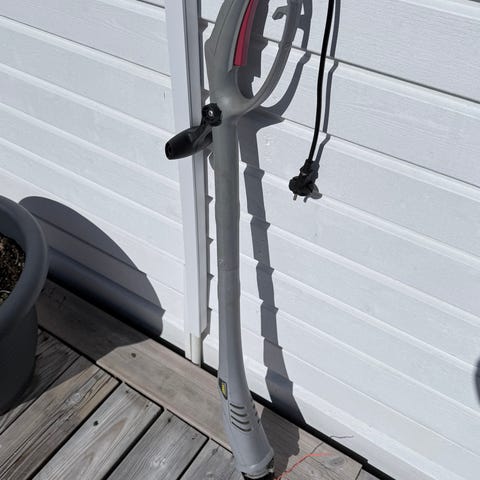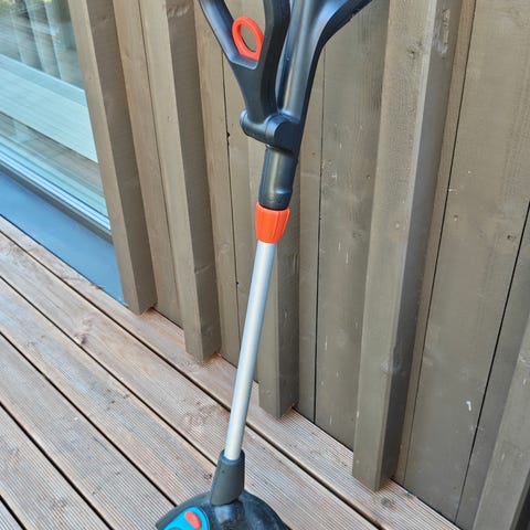 Black+Decker grästrimmer med klippbredd 33 cm. Elansluten modell med handtag upptill för bättre grepp. Trimmerhuvud med skyddskåpa i plast. Passar för trimning av gräs och kanter i trädgård och runt gångar och rabatter. Behövs ny spole.