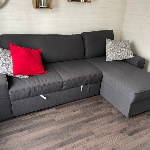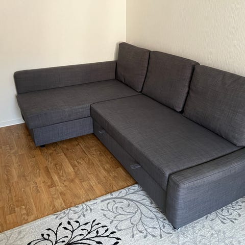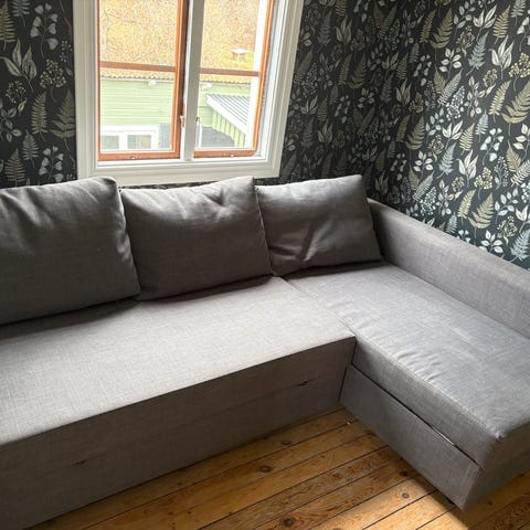 IKEA bäddsoffa i grått tyg. Soffan har schäslongdel på ena sidan och tre ryggkuddar. Rak, enkel design med klädda armstöd och ben i mörk färg. Förvaring för sängkläder under schäslomgsdelen. Bäddmått 140 cm, lätt att bädda ut och in. Mycket fint skick.