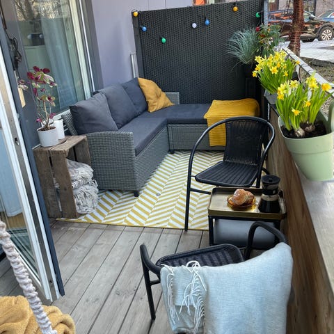 IKEA hörnsoffa i rottingliknande material med vita sitt- och ryggdynor. Soffan består av flera moduler som kan ställas ihop till en hörnlösning för balkong eller uteplats. Dynorna är tjocka och ger mjuk sittkomfort. Passar för användning i uterum, inglasad balkong eller på altan med skydd mot väder.