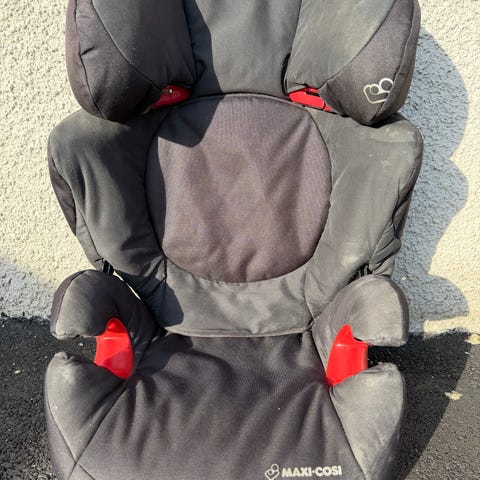 Stolen monteras framåtvänd på bilens säte och är utrustad med fästen för extra stabilitet. Klädseln är i mörk textil. Avsedd för större barn som använder bälteskudde/bältesstol i bil.
