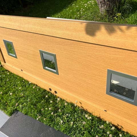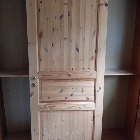 Dörr och karm i profilerad massiv ek med ”kajutafönster” säljes. Behöver en rejäl rengöring efter att ha stått i förråd ett par år, men i mycket gott skick i övrigt. (Det mörka på dörrbladet är smuts, ej röta). Karmen kan behöva en slipning i nederkant.
