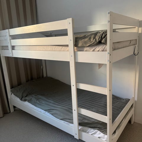 Mio våningssäng i vitlackad träkonstruktion. Sängen är stabil och har stege på sidan och skyddskanter upptill. Under finns utdragbara lådor som förvaringsutrymme. Varsamt använd när mina flickor var små och delade rum. Säljes nedmonterad.