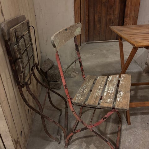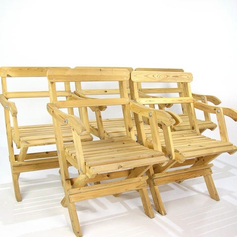 Trädgårdsset med ett bord och två stolar i trä. Möbelgruppen är utförd i brunt trä med ribbad sits, ryggstöd och bordsskiva. Passar för användning på balkong, altan eller i trädgård som matplats eller sittgrupp. Bordet har fällbara ben som underlättar förvaring när det inte används.