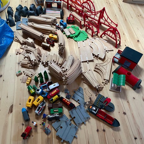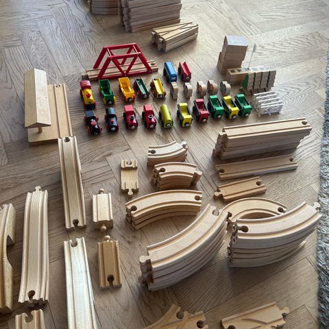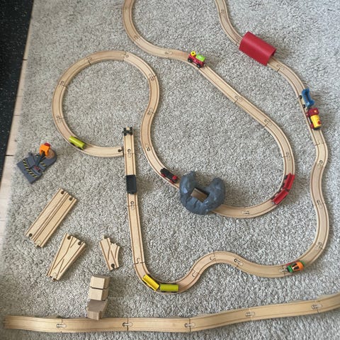BRIO tågbana i trä med flera raka och böjda rälsdelar, broar och växlingsbitar.