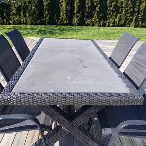 Trä matgrupp för utomhusbruk bestående av ett rektangulärt bord och flera stolar. Bordet har ribbad bordsskiva och ben i teak samt 4st stolar. Passar på altan, uteplats eller trädgård som samlingsplats för måltider och umgänge utomhus. Bordet är utdragbart med en skiva som lossas underifrån och dras isär. Så passar bordet från 6-8 platser. Hämtas på plats med fördel i Taberg centrum.