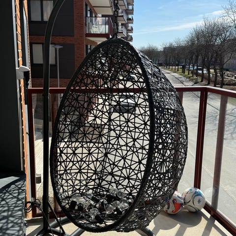 Hängstol korgstol med stativ i grå konstrotting. Stolen har en droppformad korg med flätad design och tjocka grå dynor för sits och rygg, inklusive nackkudde. Passar för användning på balkong, altan eller uteplats. Hängs upp i kedja från ett fristående metallstativ med rund fot.