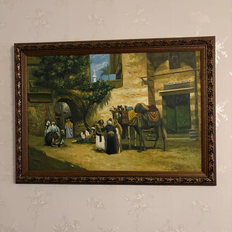 Tavla i liggande format med oljemålning som föreställer ett landsbygdsmotiv med människor samlade utomhus mellan hus och gårdsbyggnader. Färgstark komposition med blå, gröna, röda och gula toner. Målningen är inramad i en bred, profilerad träram i guldton. Passar som väggdekoration i exempelvis vardagsrum, hall eller arbetsrum.
