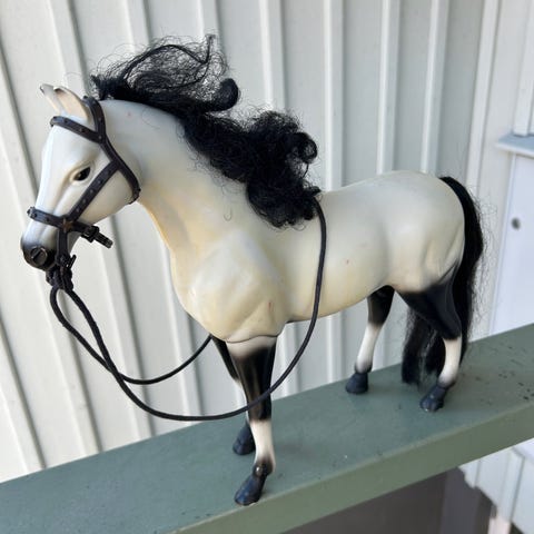 Låter om man trycker på ena örat, gnäggar och låter som att den galopperar. Rör sig inte.
