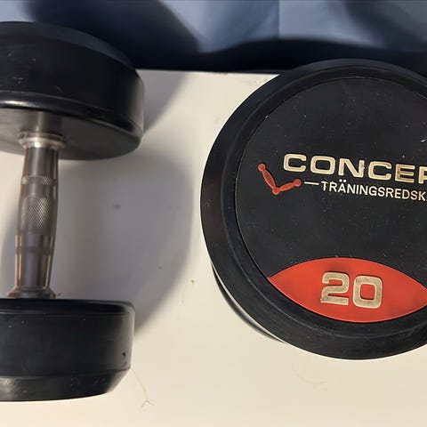 Andy hantelset med viktskivor, hantelstång och förvaringsväska. Setet innehåller flera runda viktskivor i blågrön färg med grepphål, märkta med olika vikter (bland annat 1,25 kg och 0,91 kg). Hantelstången är rak med gängor i ändarna och låses med stjärnformade muttrar. Levereras i en hård plastväska med handtag för enkel förvaring och transport. Passar för enklare styrketräning i hemmet, till exempel arm-, axel- och överkroppsträning.