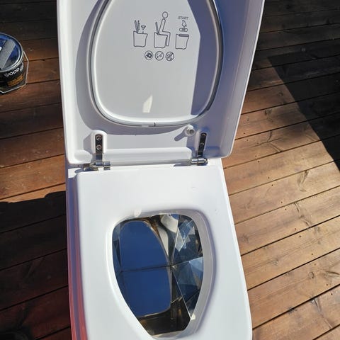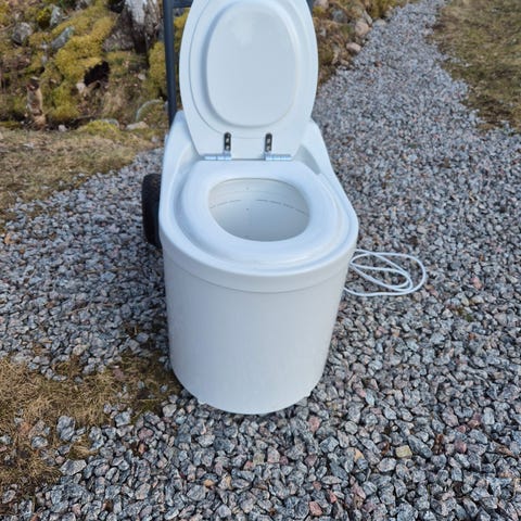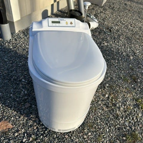 Toaletten är fristående och kan användas i exempelvis stuga eller andra platser utan fast avlopp. Överdelen har lock och en panel med knappar och symboler för styrning. Ansluts till vanligt vägguttag för ström väldigt lätt använd och smidig