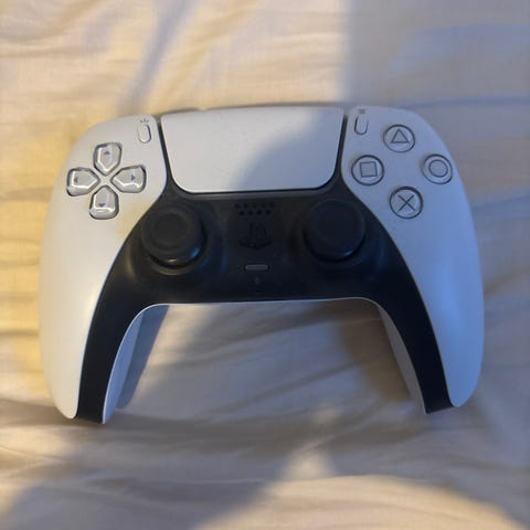 Sony DualSense handkontroll i vit färg. Båda joysticken är lite skadade och den har blivit avfärgad på baksidan av att den har legat.