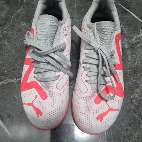 Puma fotbollsskor för junior i vitt med rosa och orange detaljer. Skorna har snörning framtill och ovandel i syntetmaterial. Inomhussko.. Storlek 34. Varsamt använda! Använda av en tjej en inomhus säsong.