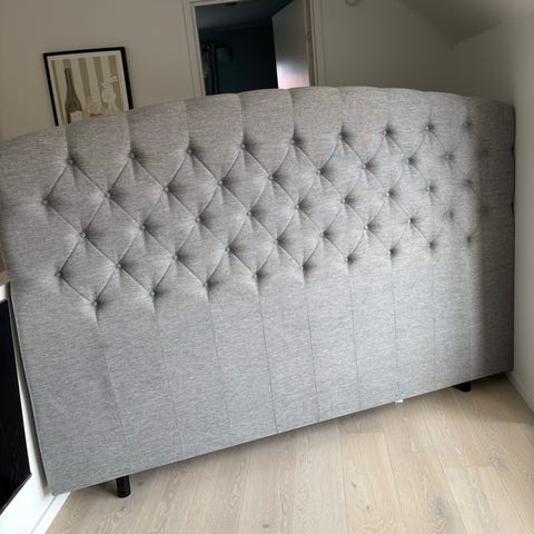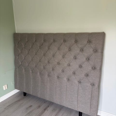 Mio sänggavel i grå textil med knapptuftad, vadderad framsida. Gaveln har raka linjer och står på ben i trä. Passar som huvudgavel till säng och ger ett mjukt stöd bakom kuddar vid sittande i sängen. Neutral grå färg som fungerar tillsammans med många olika sängar och sovrumsstilar.