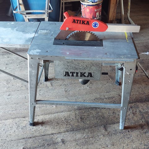 Clas Ohlson klyv med stativ. Utrustad med använd sågklinga, skyddskåpa och justerhjul för inställning av sågbladets höjd eller vinkel. Passar för kapning och klyvning av trä- och skivmaterial i verkstad, garage eller på byggarbetsplats. CE-märkt. Hämtas i Norrmjöle av köparen.