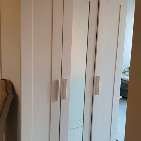 Garderob med stort fack för att hänga kläder eller annan förvaring. En sida med hyllplan