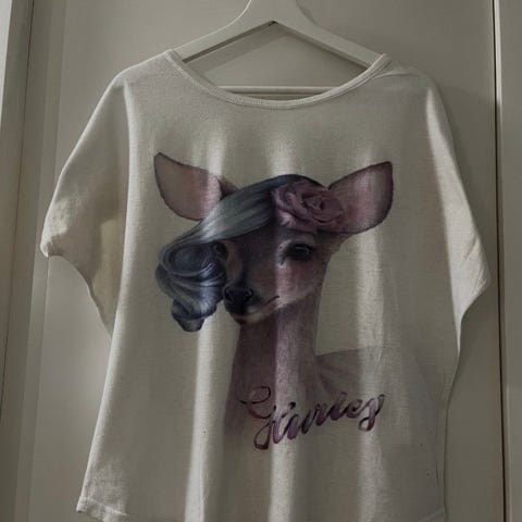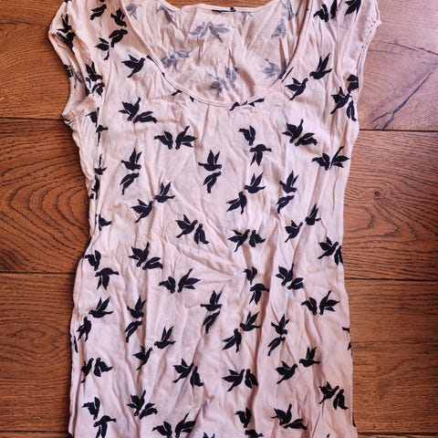 Det är som en lång grå sov tröja som är längre i midjan och har ett svart blommigt mönster på magen, det är i storlek S