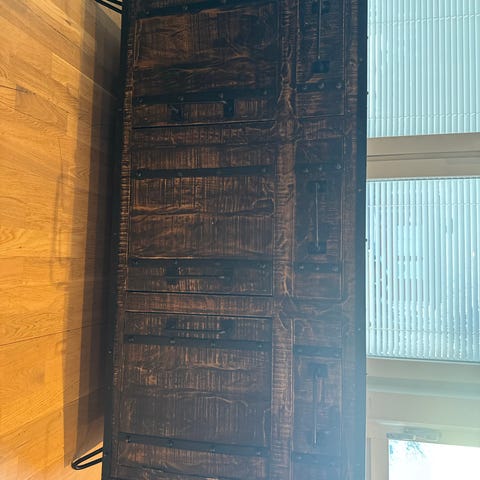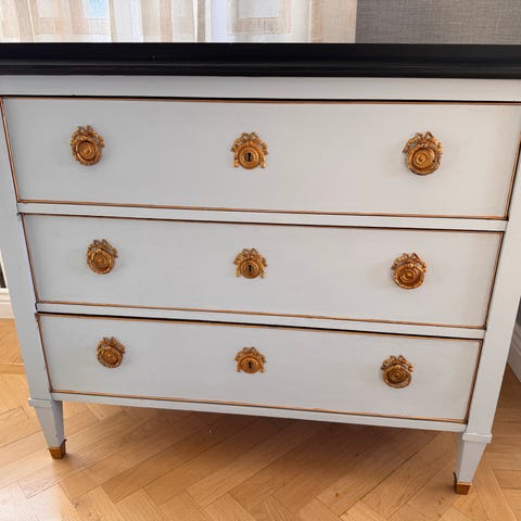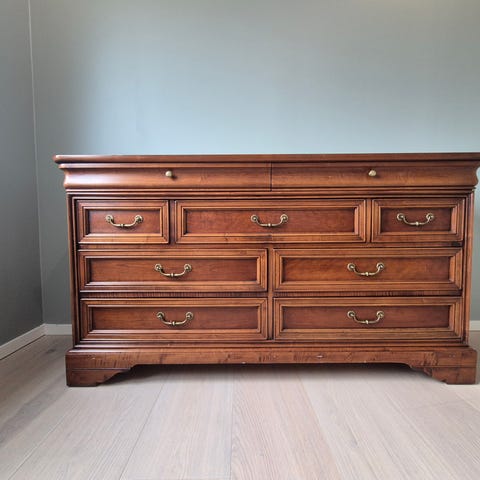 Byrå i trä med rustik, flerfärgad front. Möbeln har flera lådor i olika trätoner med inslag av turkosa och ljusa partier. Varje låda har en rund metallknopp. Sidorna är i massivt trä med synlig ådring. Passar som förvaringsmöbel i exempelvis vardagsrum, sovrum eller hall där det finns behov av många mindre förvaringsfack.