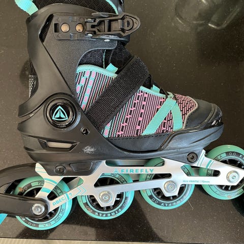 SOC TR200 inlines för rullskridskoåkning. Storlek 38 (24,8 cm innermått). Färg svart med turkosa detaljer. Modellen har hårt skaft med spänne, snörning och kardborreband för stabil passform. Fyra hjul per skridsko med ram i plast/komposit. Lämpliga för barn eller ungdom med skostorlek 38 för fritidsåkning på asfalt eller andra släta underlag.