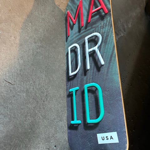 Longboard med träfärgad/brun bräda och ljusa hjul. Brädan har utskärningar vid hjulen för att minska hjulbite och en dekorativ rand på ovansidan. Undersidan är delvis svart med grafiskt tryck. Passar för cruising och pendling på asfalt och andra hårda underlag.