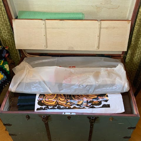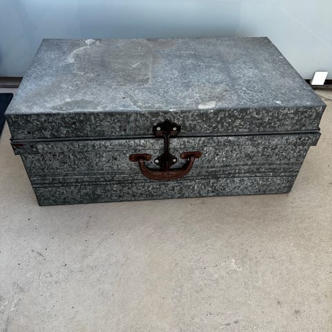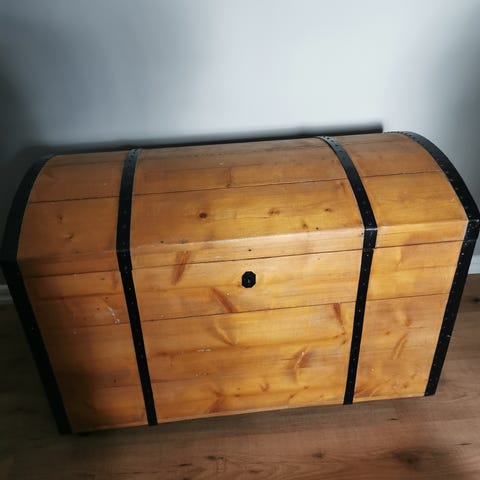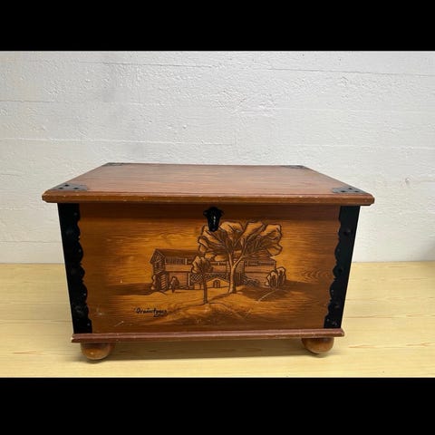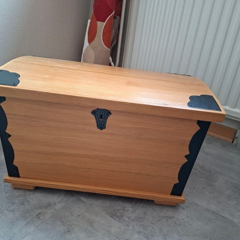 Svart kista med beige skrift. Höjd 35, Längd 60.