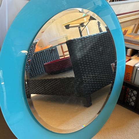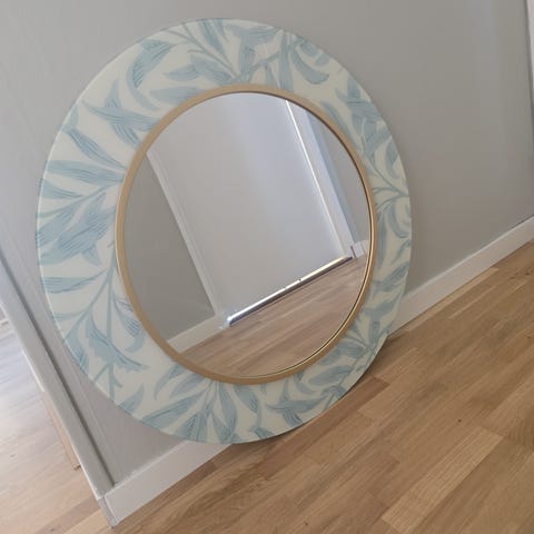 Rund spegel med ram av blå och gröna mosaikplattor i plast.